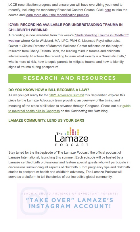 The Inside Lamaze newsletter is a vital resource for continuing education available to Lamaze members. As a member, you will receive the latest news, research, and information on upcoming events two times a month. You will find information on the latest perinatal education news and research relevant to you and the parents you are teaching that may come from the news or our blogs, Giving Birth with Confidence and Connecting the Dots. As an LCCE educator, this is a valuable tool to stay up-to-date and apprised – and it comes right to your inbox!
